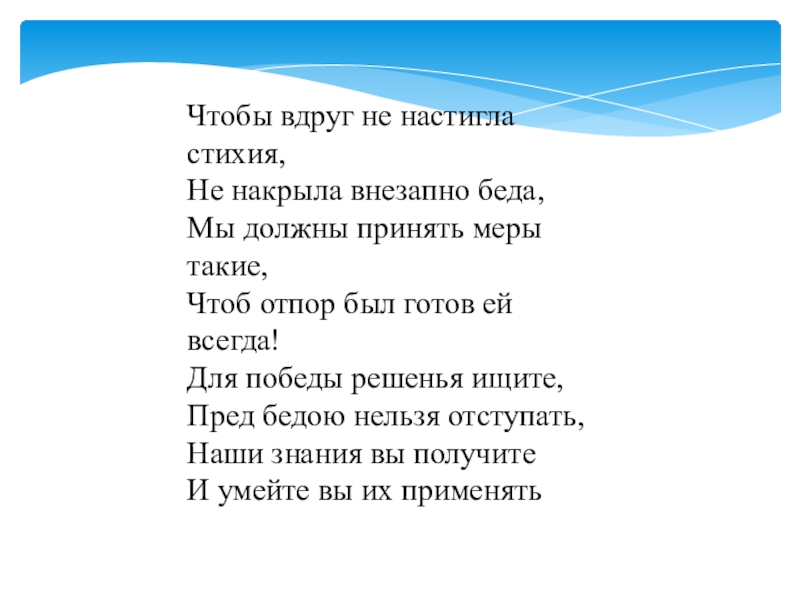 Чтобы вдруг не настигла стихия,Не накрыла внезапно беда,Мы должны принять меры такие,Чтоб отпор был готов ей всегда!Для победы решенья ищите,Пред бедою нельзя отступать,Наши знания вы получитеИ умейте вы их применять