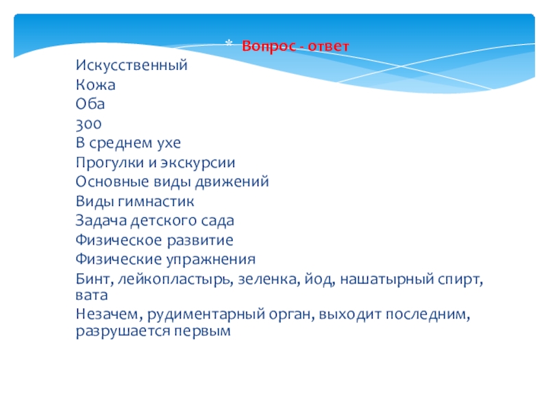 Вопрос - ответИскусственныйКожаОба300В среднем ухеПрогулки и экскурсииОсновные виды движенийВиды гимнастикЗадача детского садаФизическое развитиеФизические упражненияБинт, лейкопластырь, зеленка, йод,