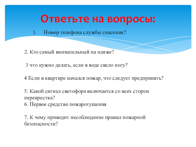 Ответьте на вопросы:Номер телефона службы спасения? 2. Кто самый внимательный на пляже?  3 что нужно делать,
