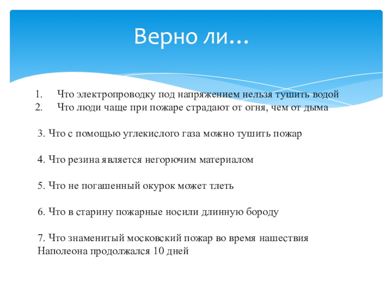 Верно ли…Что электропроводку под напряжением нельзя тушить водой Что люди чаще при пожаре страдают от огня, чем