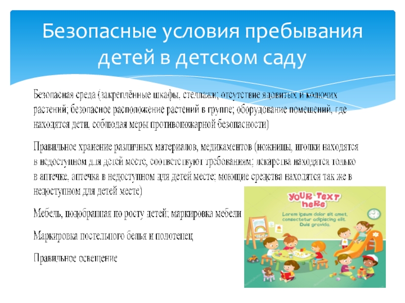 Слайд 4Безопасные условия пребывания детей в детском саду