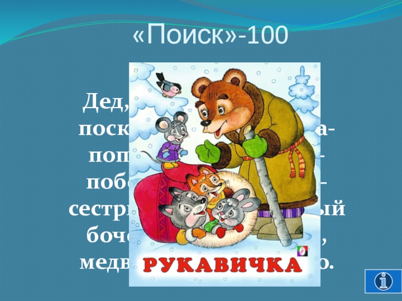 «Поиск»-100Дед, собачка, мышка-поскребушка, лягушка-попрыгушка, зайчик-побегайчик, лисичка-сестричка, волчок-серый бочок, кабан-клыкан, медведюшко-батюшко.