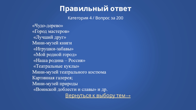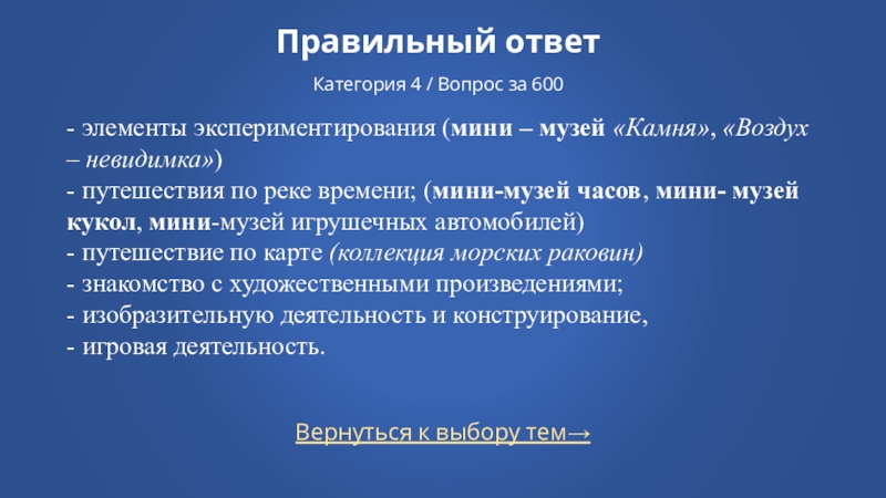 - путешествия по реке времени; (мини-музей часов, мини- музей кукол, мини-музей игрушечных автомобилей)