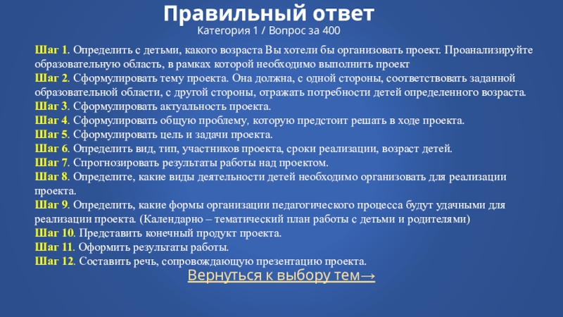 Шаг 2. Сформулировать тему проекта. Она должна, с одной стороны, соответствовать заданной образовательной области, с другой стороны, отражать потребности детей определенного возраста.