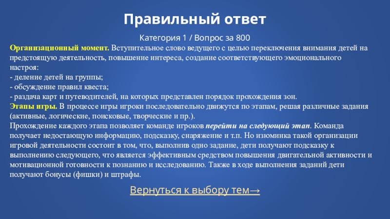 Прохождение каждого этапа позволяет команде игроков перейти на следующий этап. Команда получает недостающую информацию, подсказку, снаряжение и т.п. Но изюминка такой организации игровой деятельности состоит в том, что, выполнив одно задание, дети получают подсказку к выполнению следующего, что является эффективным средством повышения двигательной активности и мотивационной готовности к познанию и исследованию. Также в ходе выполнения заданий дети получают бонусы (фишки) и штрафы.