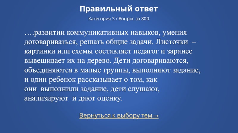 навыков, умения договариваться, решать общие задачи. Листочки – картинки или схемы составляет педагог и заранее вывешивает их на дерево. Дети договариваются, объединяются в малые группы, выполняют задание, и один ребенок рассказывает о том, как они выполнили задание, дети слушают, анализируют и дают оценку.