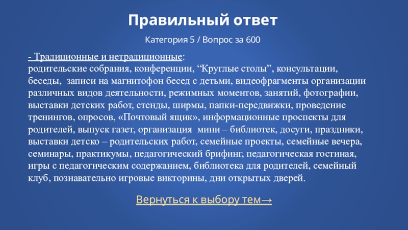 родительские собрания, конференции, “Круглые столы”, консультации, беседы, записи на магнитофон бесед с детьми, видеофрагменты организации различных видов деятельности, режимных моментов, занятий, фотографии, выставки детских работ, стенды, ширмы, папки-передвижки, проведение тренингов, опросов, «Почтовый ящик», информационные проспекты для родителей, выпуск газет, организация мини – библиотек, досуги, праздники, выставки детско – родительских работ, семейные проекты, семейные вечера, семинары, практикумы, педагогический брифинг, педагогическая гостиная, игры с педагогическим содержанием, библиотека для родителей, семейный клуб, познавательно игровые викторины, дни открытых дверей.