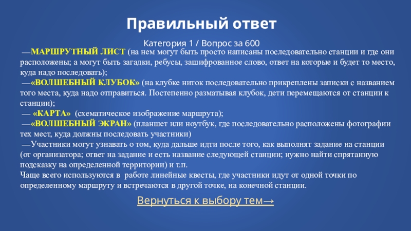 Чаще всего используются в работе линейные квесты, где участники идут от одной точки по определенному маршруту и встречаются в другой точке, на конечной станции.