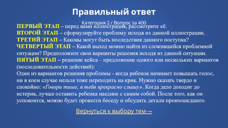ПЯТЫЙ ЭТАП – решение кейса – предложение одного или нескольких вариантов (последовательности действий):