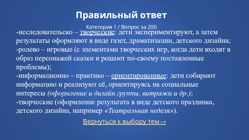 -творческие (оформление результата в виде детского праздника, детского дизайна, например «Театральная неделя»).