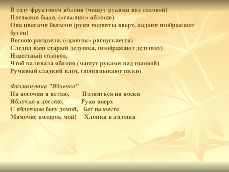 цветами белыми (руки подняты вверх, ладони изображают бутон) Весною расцвела. («цветок» распускается) Следил наш старый дедушка, (изображают дедушку) Известный садовод, Чтоб наливала яблоня (машут руками над головой) Румяный сладкий плод. (пощипывают щеки)