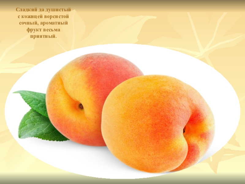 Слайд 6Сладкий да душистый с кожицей ворсистой сочный, ароматный фрукт весьма приятный.
