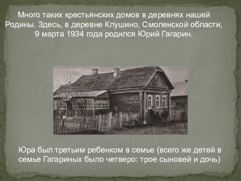 Много таких крестьянских домов в деревнях нашей Родины. Здесь, в деревне Клушино, Смоленской области, 9 марта 1934 года родился Юрий Гагарин.