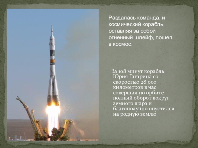 За 108 минут корабль Юрия Гагарина со скоростью 28 000 километров в час совершил по орбите полный оборот вокруг земного шара и благополучно опустился на родную землю