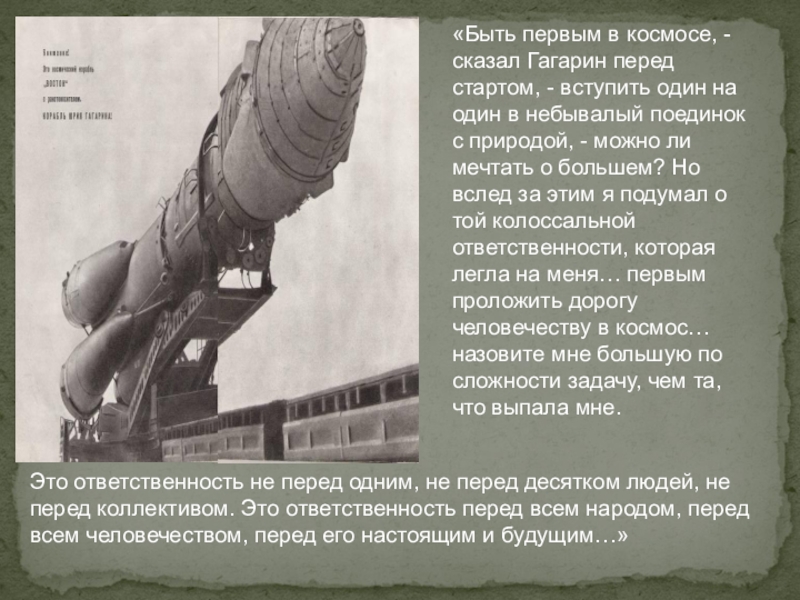 Это ответственность не перед одним, не перед десятком людей, не перед коллективом. Это ответственность перед всем народом, перед всем человечеством, перед его настоящим и будущим…»