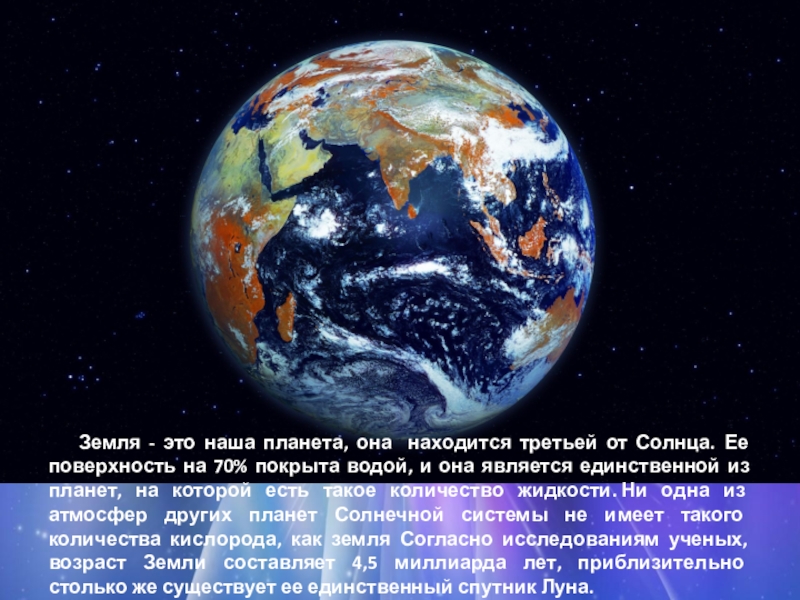 поверхность на 70% покрыта водой, и она является единственной из планет, на которой есть такое количество жидкости. Ни одна из атмосфер других планет Солнечной системы не имеет такого количества кислорода, как земля Согласно исследованиям ученых, возраст Земли составляет 4,5 миллиарда лет, приблизительно столько же существует ее единственный спутник Луна.
