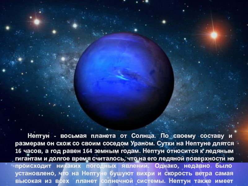 Слайд 13Нептун - восьмая планета от Солнца. По своему составу и размерам