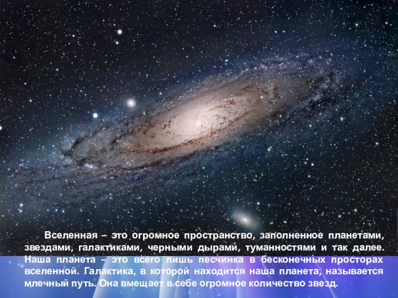 туманностями и так далее. Наша планета – это всего лишь песчинка в бесконечных просторах вселенной. Галактика, в которой находится наша планета, называется млечный путь. Она вмещает в себе огромное количество звезд.