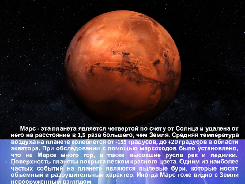 удалена от него на расстояние в 1,5 раза большего, чем Земля. Средняя температура воздуха на планете колеблется от -155 градусов, до +20 градусов в области экватора. При обследовании с помощью марсоходов было установлено, что на Марсе много гор, а также высохшие русла рек и ледники. Поверхность планеты покрыта песком красного цвета. Одним из наиболее частых событий на планете являются пылевые бури, которые носят объемный и разрушительный характер. Иногда Марс тоже видно с Земли невооруженным взглядом.