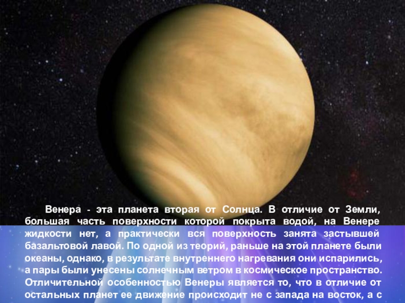 большая часть поверхности которой покрыта водой, на Венере жидкости нет, а практически вся поверхность занята застывшей базальтовой лавой. По одной из теорий, раньше на этой планете были океаны, однако, в результате внутреннего нагревания они испарились, а пары были унесены солнечным ветром в космическое пространство. Отличительной особенностью Венеры является то, что в отличие от остальных планет ее движение происходит не с запада на восток, а с востока на запад.