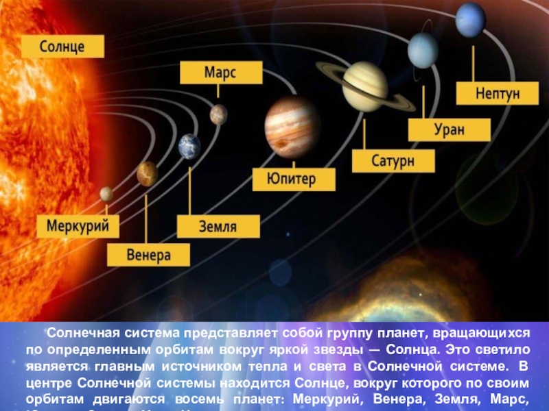 яркой звезды — Солнца. Это светило является главным источником тепла и света в Солнечной системе. В центре Солнечной системы находится Солнце, вокруг которого по своим орбитам двигаются восемь планет: Меркурий, Венера, Земля, Марс, Юпитер, Сатурн, Уран, Нептун.