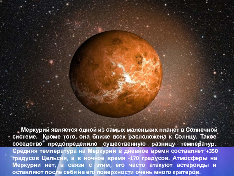 того, она ближе всех расположена к Солнцу. Такое соседство предопределило существенную разницу температур. Средняя температура на Меркурии в дневное время составляет +350 градусов Цельсия, а в ночное время -170 градусов. Атмосферы на Меркурии нет, в связи с этим, его часто атакуют астероиды и оставляют после себя на его поверхности очень много кратеров.