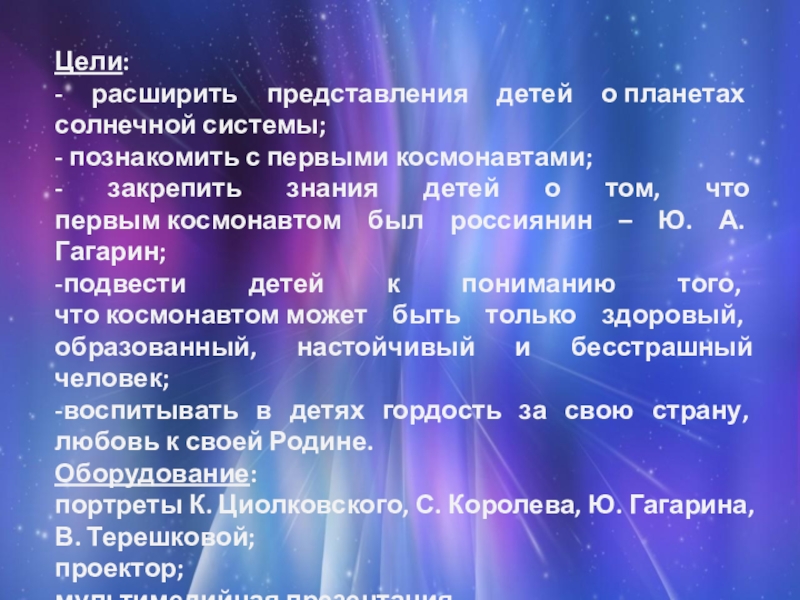 - закрепить знания детей о том, что первым космонавтом был россиянин – Ю. А. Гагарин;