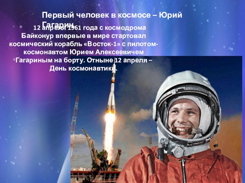 космический корабль «Восток-1» с пилотом-космонавтом Юрием Алексеевичем Гагариным на борту. Отныне 12 апреля – День космонавтики.