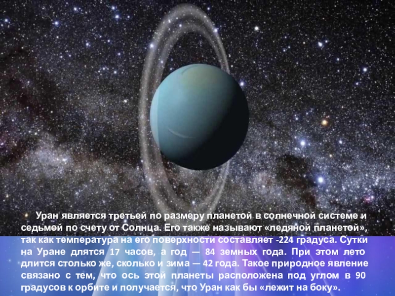 по счету от Солнца. Его также называют «ледяной планетой», так как температура на его поверхности составляет -224 градуса. Сутки на Уране длятся 17 часов, а год — 84 земных года. При этом лето длится столько же, сколько и зима — 42 года. Такое природное явление связано с тем, что ось этой планеты расположена под углом в 90 градусов к орбите и получается, что Уран как бы «лежит на боку».
