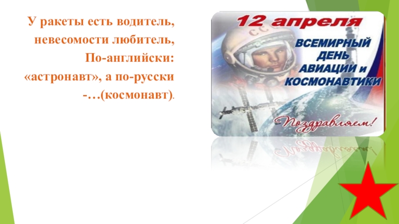 У ракеты есть водитель, невесомости любитель,По-английски: «астронавт», а по-русски -…(космонавт).