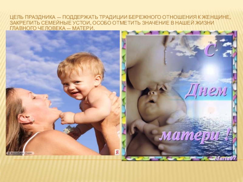Слайд 5Цель праздника — поддержать традиции бережного отношения к женщине, закрепить семейные
