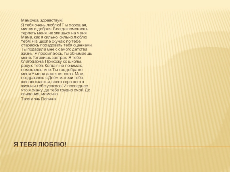 и добрая. Всегда помогаешь терпеть меня, не злишься на меня. Мама, как я сильно, сильно люблю тебя! Я в школе скучаю по тебе, стараюсь порадовать тебя оценками. Ты подарила мне с самого детства жизнь. Я просыпаюсь, ты обнимаешь меня. Готовишь завтрак. Я тебе благодарна. Прихожу со школы, радую тебя. Когда я не понимаю, помогаешь мне. Ты так добра ко меня У меня даже нет слов. Мам, поздравляю с Днём матери тебя, желаю счастья, всего хорошего в жизни и тебе успехов! И последнее что я скажу, да тебе трудно смой. До свидания, мамочка.