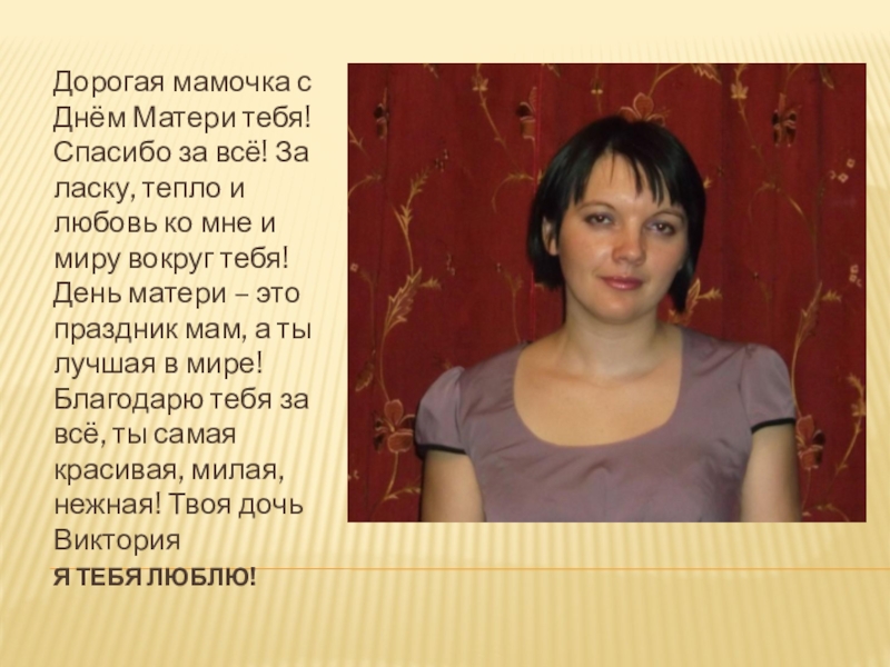 За ласку, тепло и любовь ко мне и миру вокруг тебя! День матери – это праздник мам, а ты лучшая в мире! Благодарю тебя за всё, ты самая красивая, милая, нежная! Твоя дочь Виктория