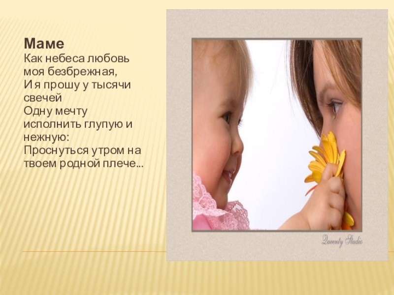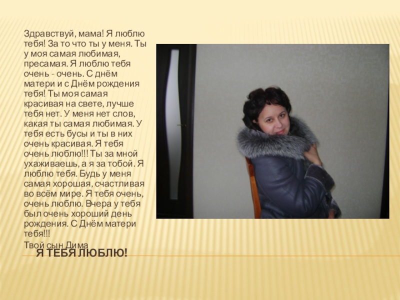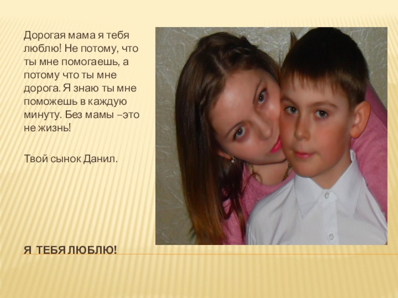 меня была и есть самая красивая, очень добрая, нежная, ласковая. Я люблю тебя за то, что ты была со мной с первых моих дней. Ты подарила мою жизнь. Твой сын Егор