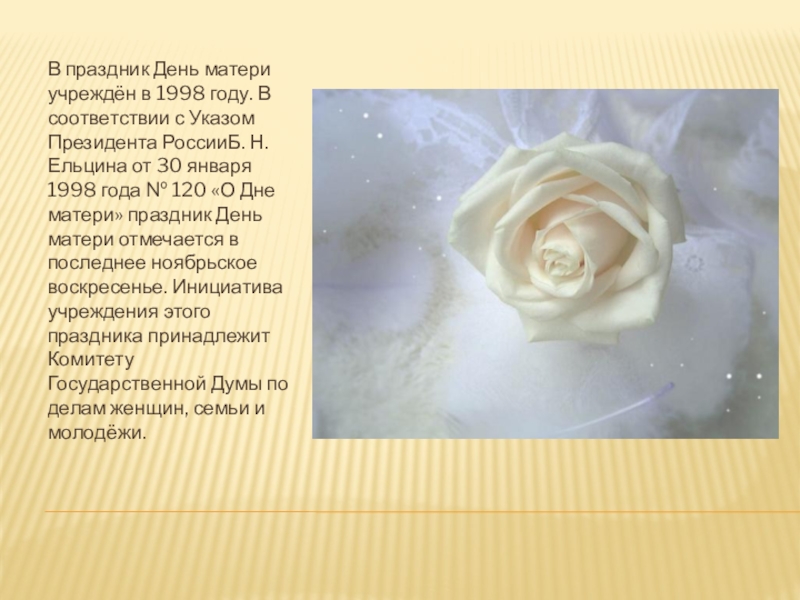 Слайд 4В праздник День матери учреждён в 1998 году. В соответствии с