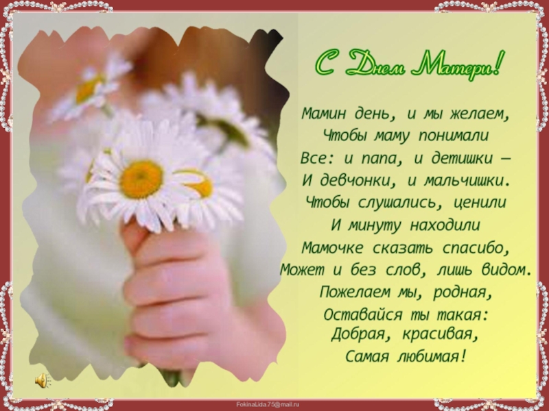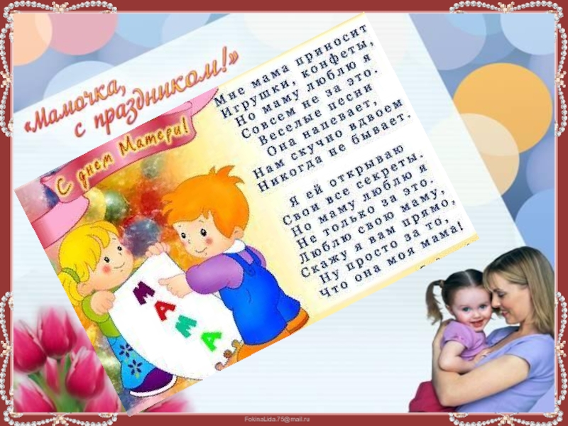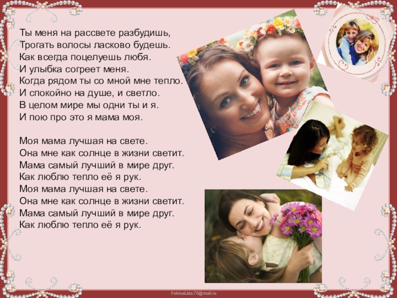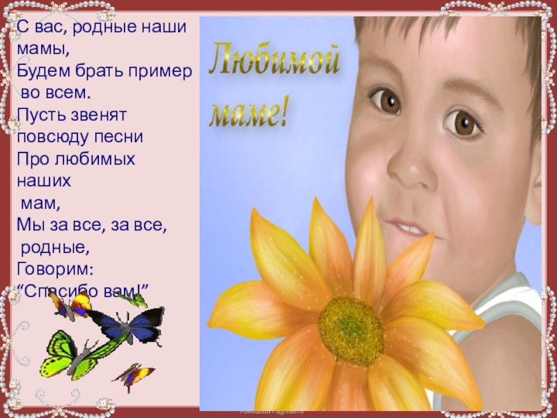 С вас, родные наши мамы,  Будем брать пример во всем. Пусть звенят повсюду песни Про любимых наших
