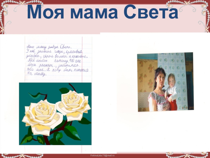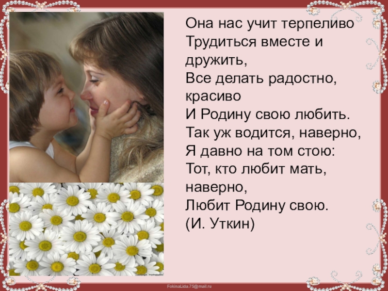 Она нас учит терпеливо Трудиться вместе и дружить, Все делать радостно, красиво И Родину свою любить. Так уж водится, наверно, Я давно на том стою: Тот, кто любит мать, наверно, Любит Родину свою. (И. Уткин)