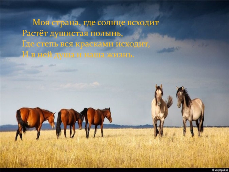 Моя страна, где солнце всходит	Растёт душистая полынь,	Где степь вся красками исходит,	И в