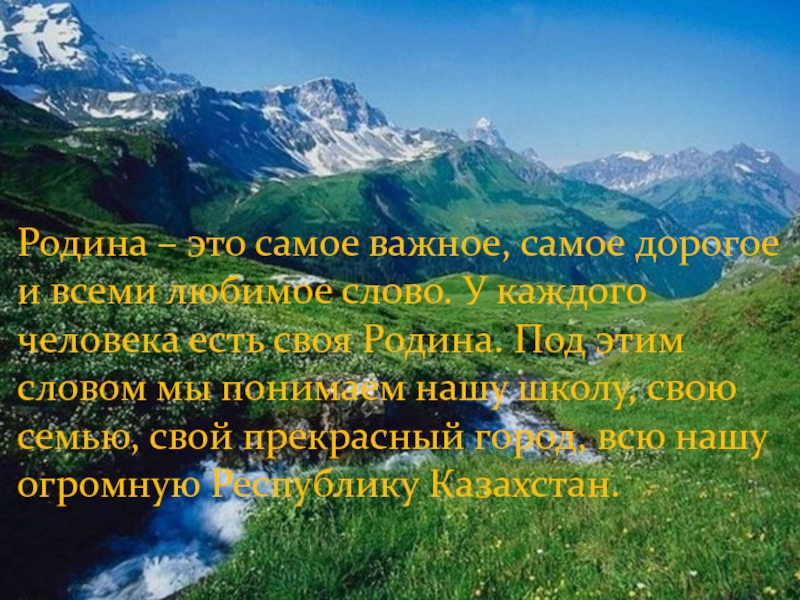 У каждого человека есть своя Родина. Под этим словом мы понимаем нашу школу, свою семью, свой прекрасный город, всю нашу огромную Республику Казахстан.