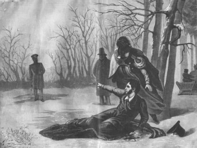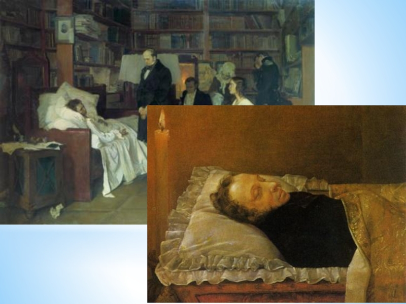 Сюда его примчали с Черной речки.Был весь в крови он и стонал от боли.Зажгли в квартире траурные
