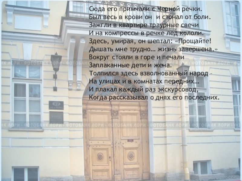 Сюда его примчали с Черной речки.Был весь в крови он и стонал от боли.Зажгли в квартире траурные свечиИ на компрессы в речке лед кололи.Здесь, умирая, он шептал: «Прощайте!Дышать мне трудно… жизнь завершена.»Вокруг стояли в горе и