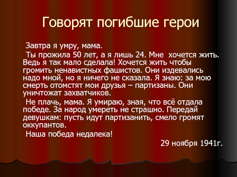 Не плачь, мама. Я умираю, зная, что всё отдала победе. За народ умереть не страшно. Передай девушкам: пусть идут партизанить, смело громят оккупантов.
