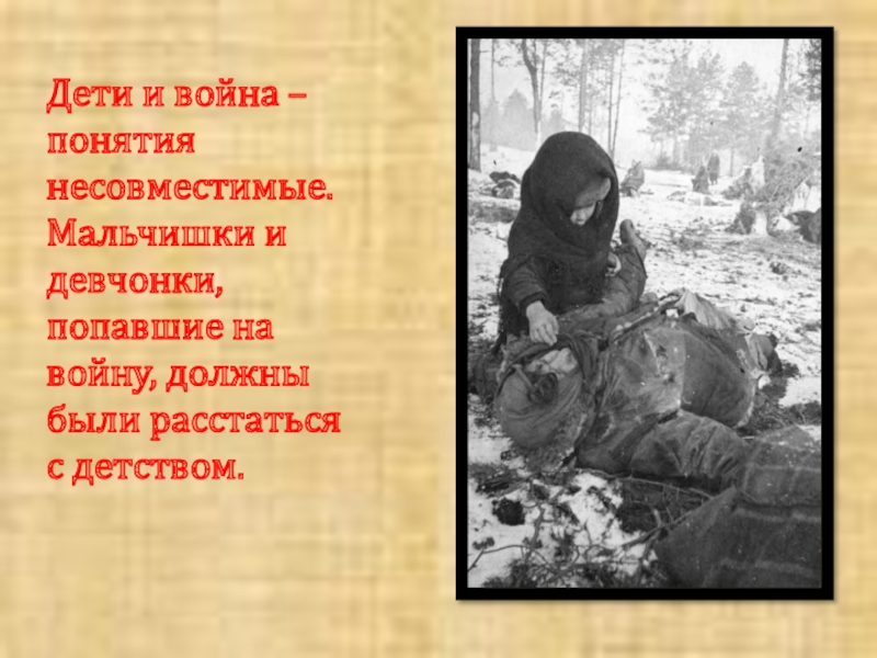 Слайд 20Дети и война – понятия несовместимые. Мальчишки и девчонки, попавшие на
