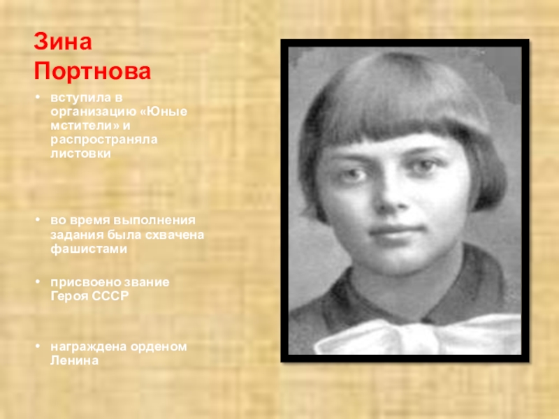 вступила в организацию «Юные мстители» и распространяла листовки