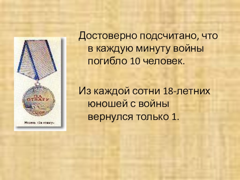 Слайд 11Достоверно подсчитано, что в каждую минуту войны погибло 10 человек.