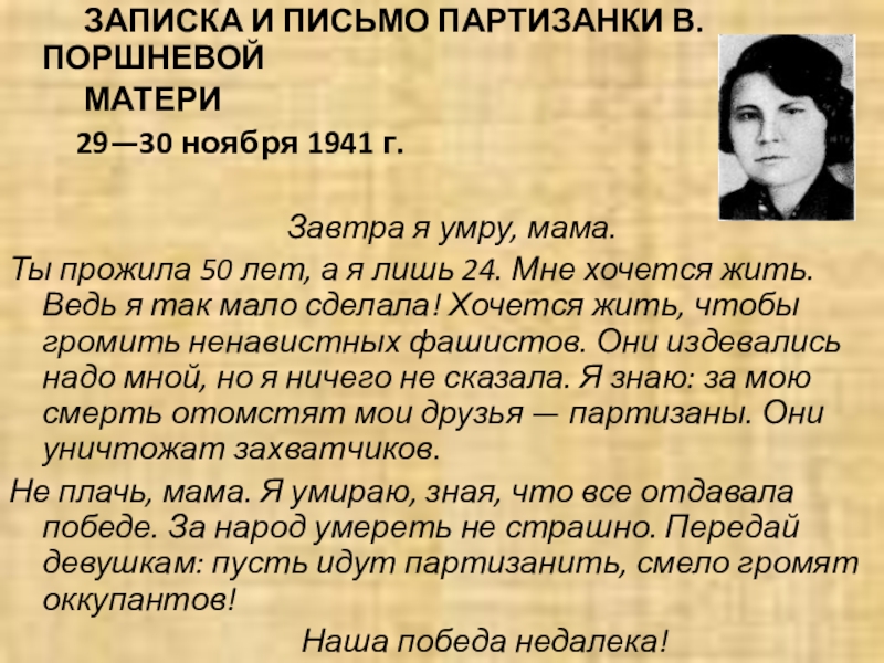 Слайд 8 ЗАПИСКА И ПИСЬМО ПАРТИЗАНКИ В. ПОРШНЕВОЙ