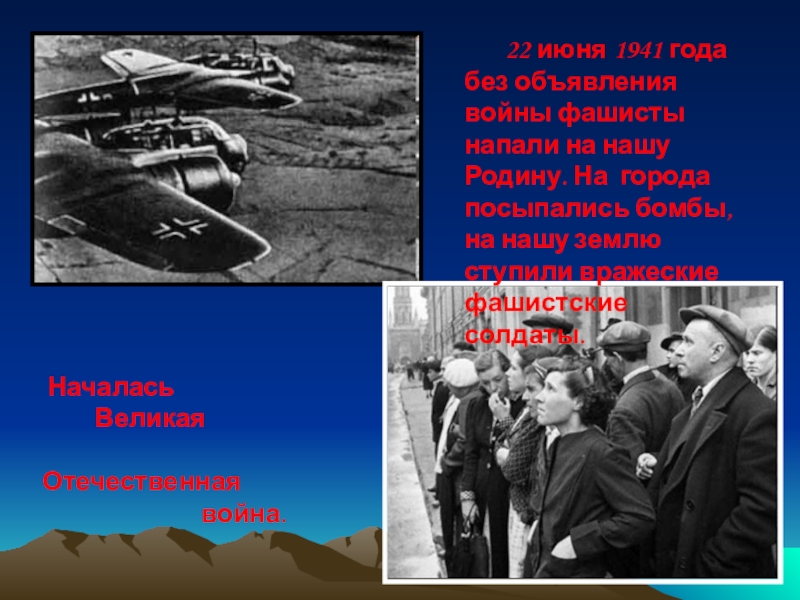 22 июня 1941 года без объявления войны фашисты напали на нашу Родину. На города посыпались бомбы, на нашу землю ступили вражеские фашистские солдаты.