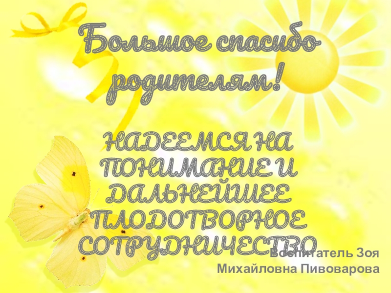 Надеемся на понимание и дальнейшее  плодотворное сотрудничество Большое спасибо родителям! Воспитатель Зоя Михайловна Пивоварова
