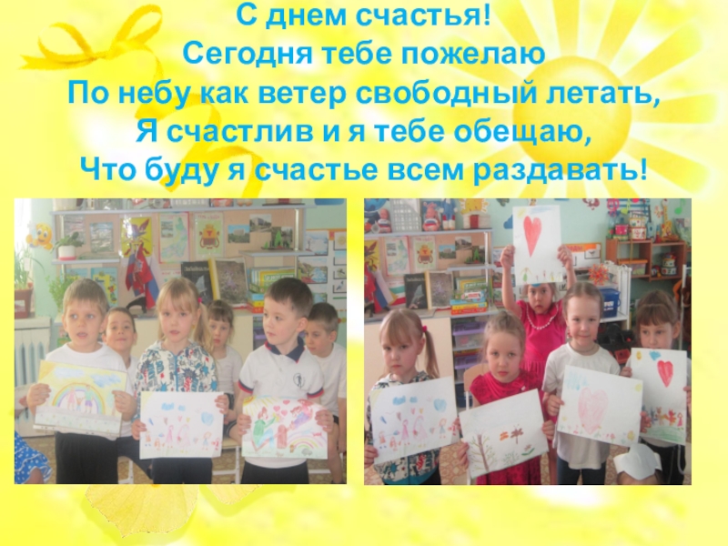 С днем счастья! Сегодня тебе пожелаю По небу как ветер свободный летать, Я счастлив и я тебе обещаю, Что буду я счастье всем раздавать!