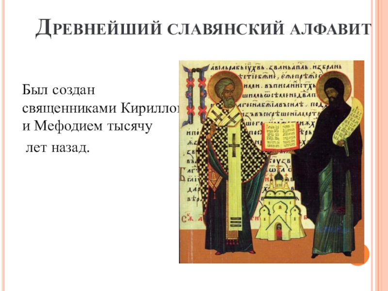 ДРЕВНЕЙШИЙ СЛАВЯНСКИЙ АЛФАВИТБыл создан священниками Кириллом и Мефодием тысячу лет назад.
